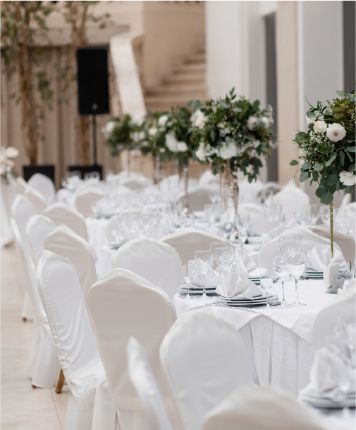 Premium glassware, dinnerware, cutlery, linens, napkins, and table cloths to elevate your event’s dining experience.